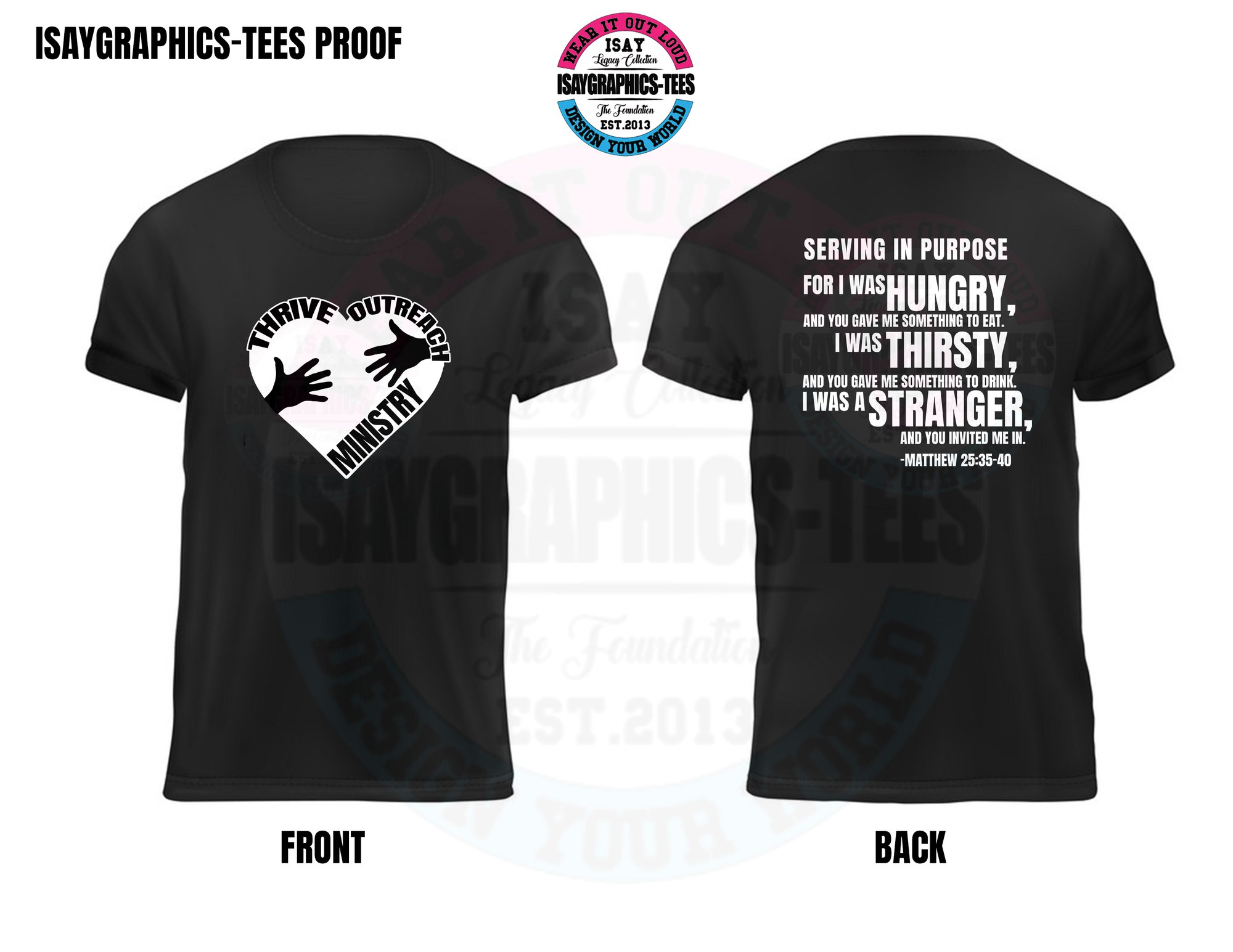 T-Shirt / Black/ front image-Heart with hands-Thrive Outreach Ministry/back- Serving in Purpose